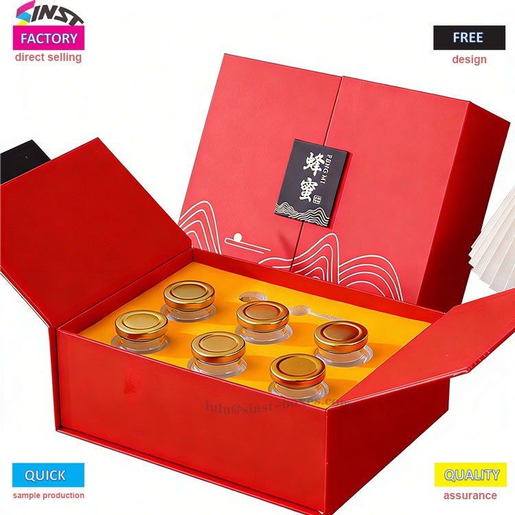 यो रातो मह उपहार बक्सले सजिलो भण्डारण र यातायातको लागि फोल्ड गर्न मिल्ने संरचनाको सुविधा सहित उच्च गुणस्तरको हार्ड कार्डबोर्डसँग सुरुचिपूर्ण तरंग ढाँचाहरू संयोजन गर्दछ। हनी गिफ्ट बक्सले विभिन्न प्रकारका गिलास जार आकारहरूलाई समर्थन गर्दछ (मह/टोनिकका लागि) र सामग्रीहरू समात्न अनुकूलन फोम घुसाउनुहोस्। युरोपेली, अमेरिकी, र दक्षिणपूर्व एशियाली बजारहरूमा उपहार प्राथमिकताहरू अनुरूप, छुट्टी उपहारहरू, व्यापार उपहारहरू, र स्वास्थ्य उत्पादन प्याकेजिङका लागि धेरै उपयुक्त। यो बक्स हल्का, स्टाइलिश, र उत्पादन मूल्य वृद्धि गर्दा लागत प्रभावी छ।