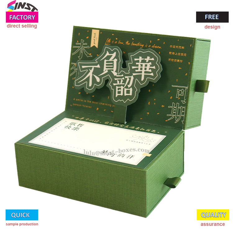 SINST प्याकेजिङ र प्रिन्टिङद्वारा सीधै बिक्री हुने यो परफ्युम गिफ्ट बक्सले मुख्य टोनको रूपमा ताजा हरियो लिन्छ। दराज प्रकार बक्स शरीर तीन-आयामी कलात्मक वर्ण र सुन सजावट संग सुसज्जित छ। अत्तर उपहार बक्सको छेउ "शाओ" र "क्यूई" ले सजाइएको छ, र भित्री कुशन ग्रूभ स्थिर र सुगन्धित छ, स्वादिष्टता देखाउँदै। कलात्मक भावना र अनुष्ठान भावनाको सह-अस्तित्व भावनाहरू व्यक्त गर्नको लागि गुणस्तर विकल्प हो।