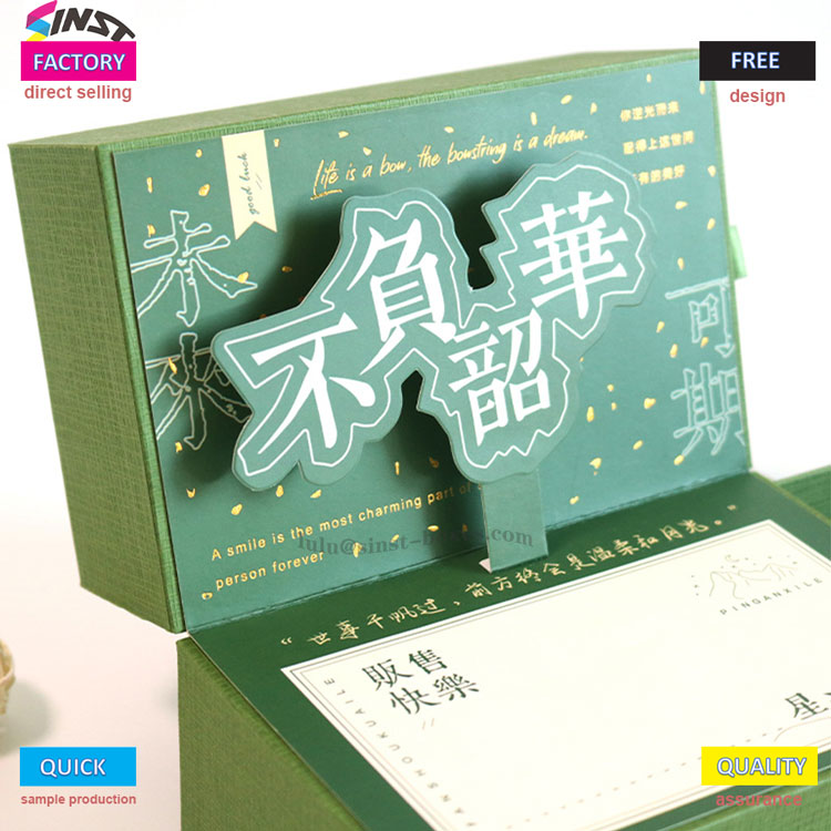 यस डिलक्स उपहार बक्सको शरीर हरियो कपडा बनावट सामग्रीले ढाकिएको छ, जसमा नाजुक स्पर्श छ; बाकसको कभर सानो सुन्तला रंगको सजावटले घेरिएको तीन-आयामी क्यारेक्टरहरू "नेभर गिभ अप टु युथ" वरिपरि केन्द्रित छ। माथिका शब्दहरू अंग्रेजीमा छापिएका छन् जस्तै "A smile is the most charming", न्यानो वातावरण र उपहार बाकसले बोकेका भावनाहरू व्यक्त गर्ने।