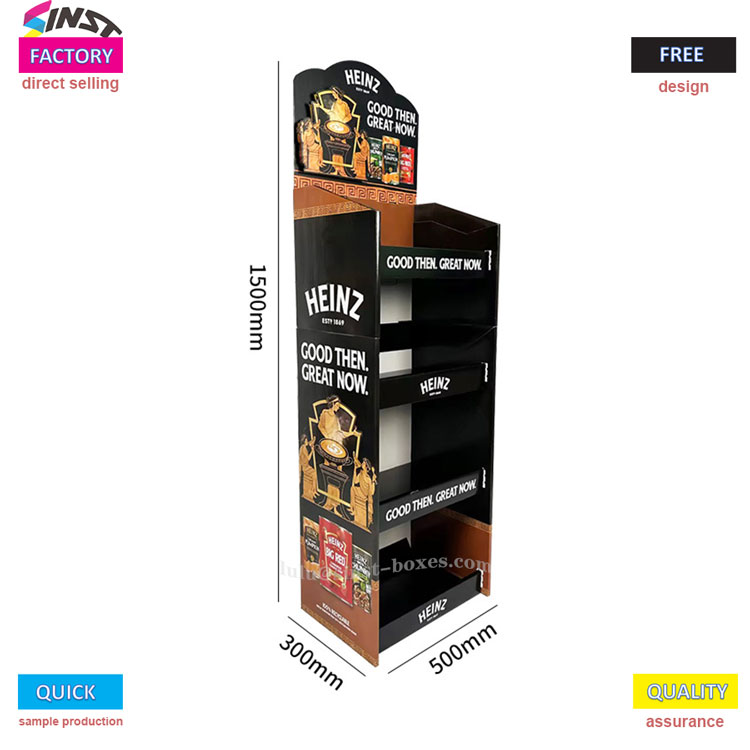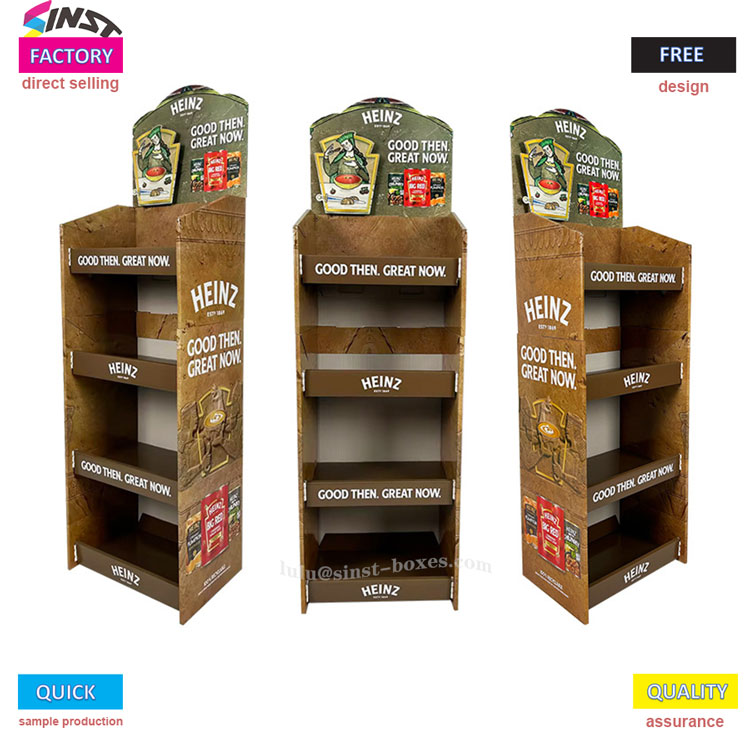 यो टमाटर सॉस डिस्प्ले र्याक सुपरमार्केट र सुविधा स्टोरहरू सस प्रदर्शन गर्नको लागि "सानो सहायक" हो। यो एक प्रकारको सस डिस्प्ले र्याकसँग सम्बन्धित छ, कार्डबोर्ड पेपर डिस्प्ले र्याकले बनेको छ, जुन हल्का र बोक्न सजिलो छ। यसलाई अनप्याक गरी काउन्टरमा राख्ने बित्तिकै प्रयोग गर्न सकिन्छ। शेल्फलाई चार तहमा विभाजन गरिएको छ, प्रत्येक तहले टमाटर ससको बोतलका दुई पङ्क्तिहरू समात्न सक्छ, र त्यहाँ केही सलाद ड्रेसिङ र यसको छेउमा मीठो र मसलादार चटनी पनि हुन सक्छ - यसलाई "टमाटो सस प्रदर्शन शेल्फ" भनिन्छ, तर यसलाई सस शेल्फको रूपमा पनि प्रयोग गर्न सकिन्छ। यसलाई सानो सुपरमार्केटको मसला क्षेत्रमा राख्न उपयुक्त छ।